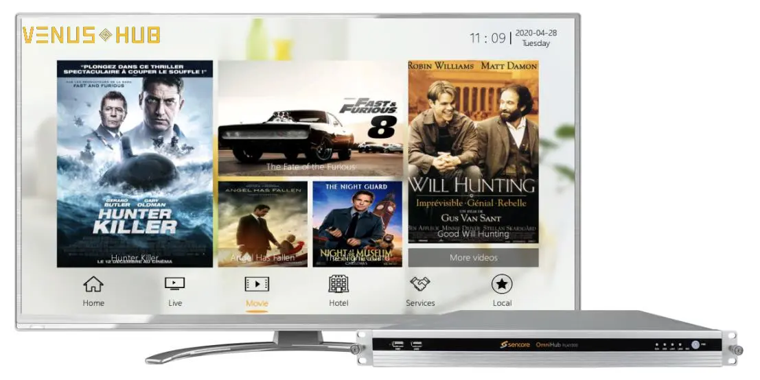 VenusHub offers an intuitive yet powerful IPTV end to end solution for centralized management of TVs and Set-Top boxes perfect for hotels, vessels, hospitals, education, or any facility with IP based video across multiple end devices and televisions. It is easily customizable to access live channels, video-on-demand assets with interactive content and digital signage via a user-friendly web-interface. Easily customize your guest experience with additional on-screen elements, such as facility information, video-on demand, or digital advertising.